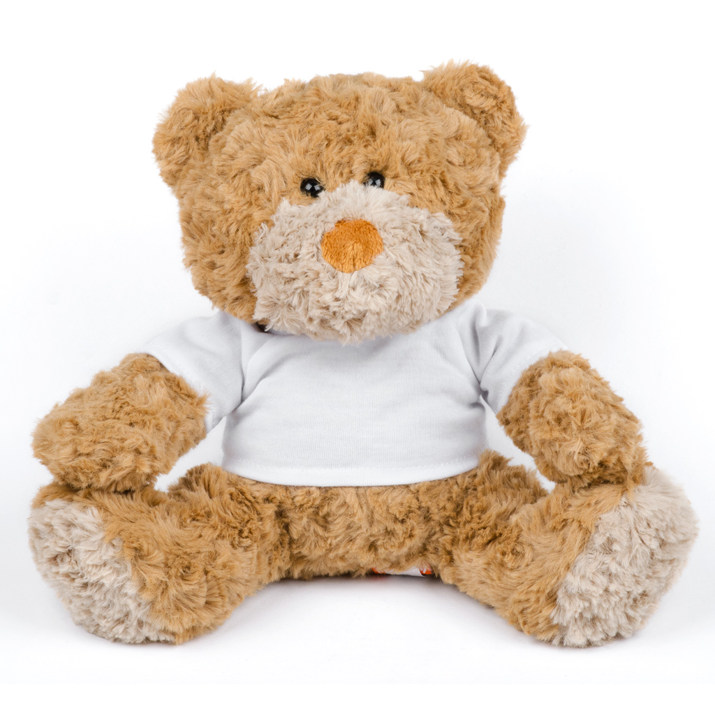 Plyšový medvídek v bílém tričku určeném pro sublimační potisk. Heboučký a měkký plyš. Je možné zakoupit i bez potisku. Výška hračky vsedě je 23 cm. Vhodná jako vtipný nebo romantický dárek k Valentýnu, narozeninám či k Vánocům, pro partnera, nebo děti.